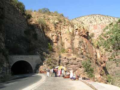 | Auf dem Weg zum Krügerpark durchquerten wir eine relativ karge Landschaft und schließlich die Dragensberge. Auf dem Pass war ein Stop am Strijdom Tunnel angesagt. Der Tunnels ist ca. 50m lang und während auf der einen Seite schöne Bergmassive und dieser Wasserfall zu bestaunen waren gab es auf der anderen Seite einen weiten Blick ins Land und viele Souvenire. Der Pass ist ca. 1800 m hoch und von Hier ausgeht es hinab zum Krügerpark. Der ca. 44000km² große Park wurde 1910 gegründet und grenzt im Norden an Simbabwe, im Osten an Mosambique und im Süden an das Königreich Swaziland. | |||||||||||||||||||||||||
