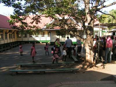 | Am 1.6.05 besuchten wir diese katholische Einrichtung, eine Gesamtschule. Unter Leitung der Oberin Schwester Hermine werden hier über den Tag ca. 2000 Kinder im Alter von 3 bis 18 Jahren betreut. Das Reiseunternehmen hat eine Patenschaft mit der Schule und wie man an den Strategen erkennen kann, freut man sich wenn die Touristen kommen. Denn dann gibt’s auch was für die Kleinen. Die Schule schlicht aber sauber und die Klassenzimmer sind freundlich gestaltet. Die Schüler können hier auch das Abitur machen und wie uns die Oberin sagte hat die Schule einen guten Ruf und die abgehenden Schüler sind durchaus gefragt. Unten rechts ist die Oberin mit jungen angehenden Priestern im Gespräch. Insgesamt war unser Eindruck sehr positiv von der Schule und den Kindern. |